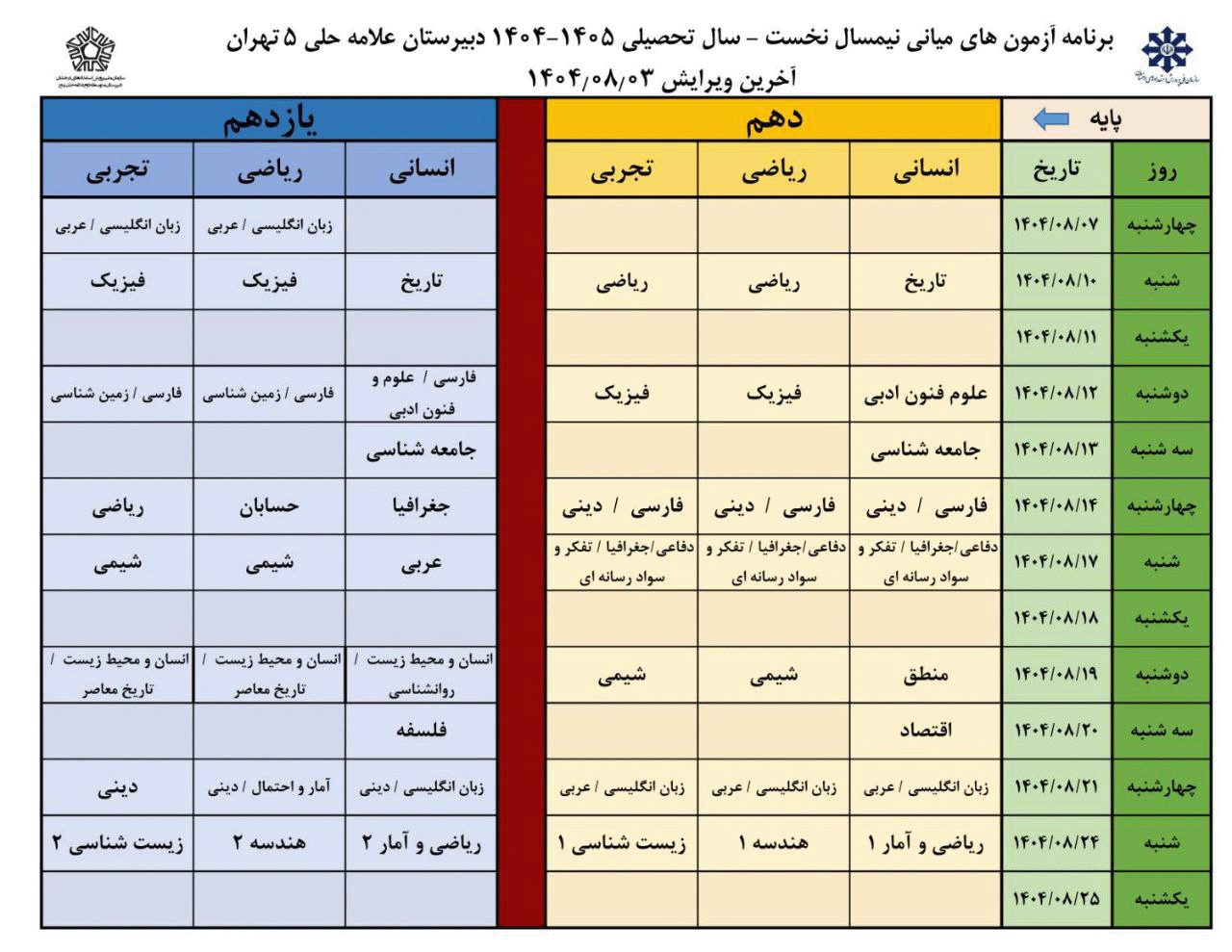 رنامه آزمونهای میانی نیمسال نخست دبیرستان علامهحلی ۵ تهران اعلام شد.
